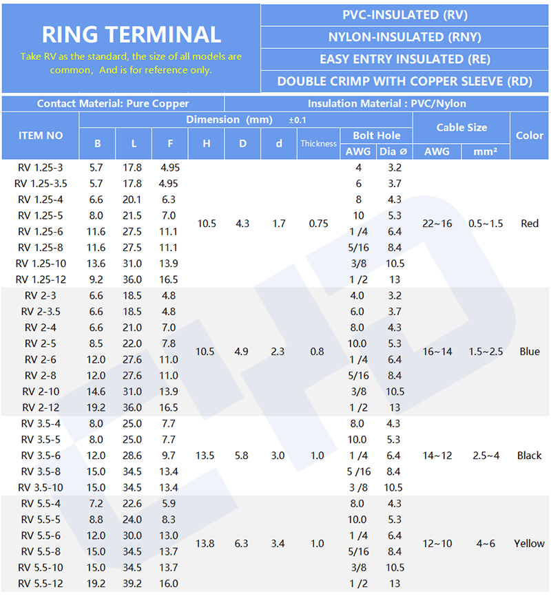 PVC Insulated Ring Terminals are designed to provide safe, durable, and reliable electrical connections for a wide range of wiring applications. These crimp ring connectors feature a high-conductivity copper ring with a tin-plated surface and a protective PVC insulation sleeve, ensuring excellent electrical performance, corrosion resistance, and enhanced installation safety.