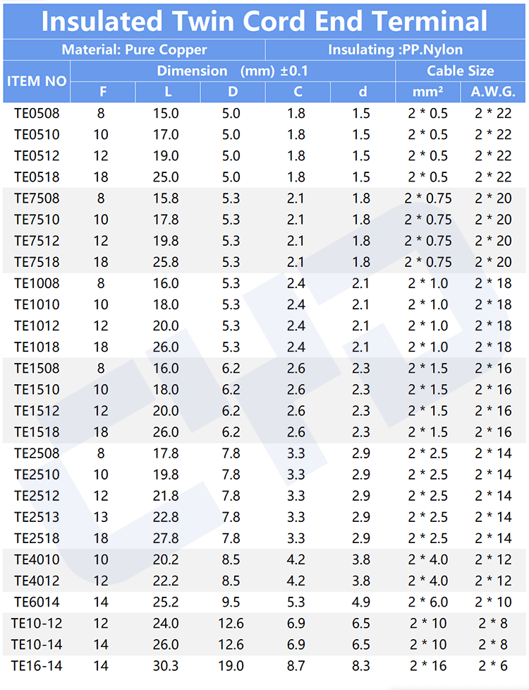 Insulated Twin Cord End Terminal | Insulated Double Wire End Ferrules | AWG 22-6